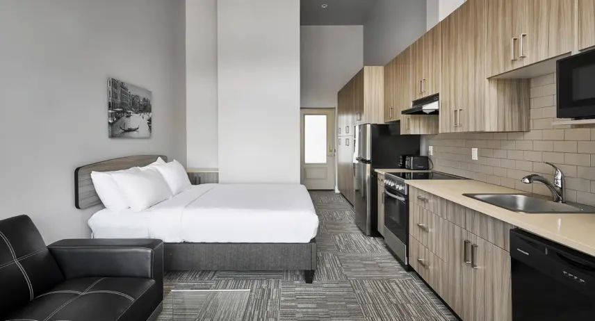 These open-concept studios also come complete with a comfy pull-out couch where you can watch the 42″ 4K Telus Optik TV featuring basic cable. The TV also allows you to log in to your movie subscription services, like Netflix, so you can catch the next episode of your favourite show.
