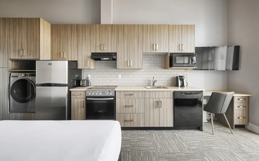 Boasting 12-foot ceilings and large windows with breathtaking mountain views, our Executive Studios are bright and airy. Make yourself at home—prepare a delicious dinner in your gourmet kitchen and catch up on laundry whenever you need to with your in-suite washer and dryer.