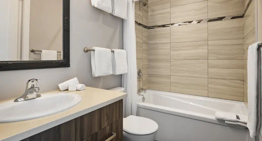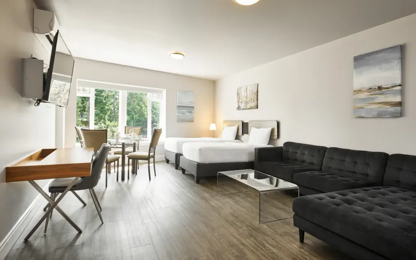 This spacious one bedroom suite is an excellent option for groups, with a king-size bed in the bedroom and two twin beds in the living area. There is a comfortable sectional sofa in the large living room, offering plenty of space for relaxing while reading a book or watching the 42″ 4K Telus Optik TV.