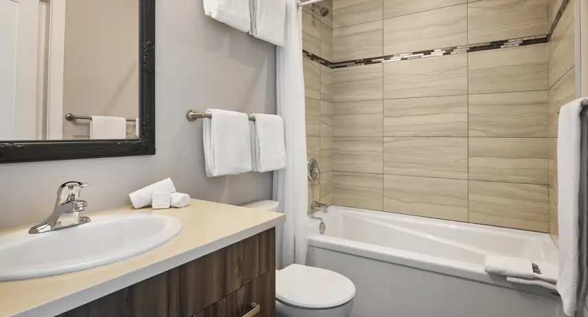 Our one bedroom suites are spacious and open, with large windows streaming lots of natural light. In the living room, relax on the sectional couch while your in-suite laundry is on. Watch the 42″ 4K Telus Optik TV, which has basic cable and Netflix login access, so you can catch the next episode of your favourite show.
