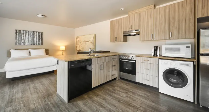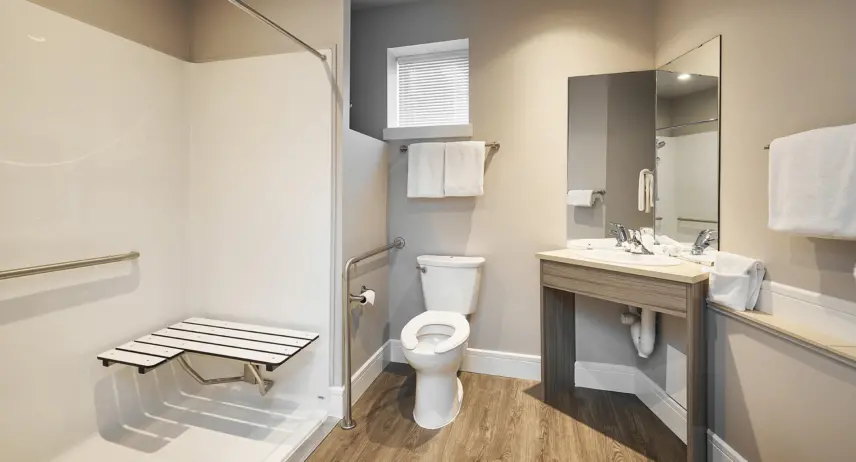 Located on the main floor of the hotel, our wheelchair accessible studio faces Goldstream Avenue. A rolling ramp brings you up to floor level of the unit and with keyless entry, it’s easy to get through the door. In addition, the bathroom features a roll-in shower.