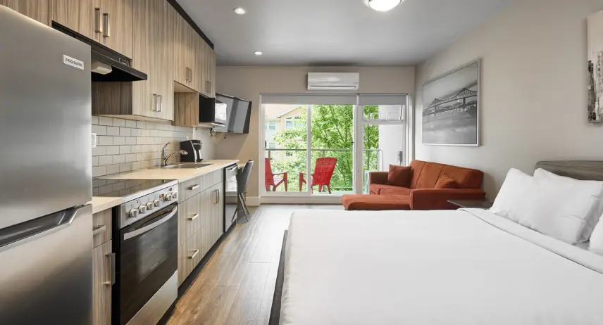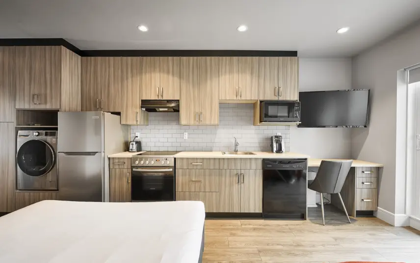 Make yourself at home—prepare a delicious dinner in your kitchen and catch up on laundry whenever you need to with your in-suite washer and dryer. Some of our studios are pet-friendly, so you can bring along up to two furry friends! Please note, a daily fee applies.