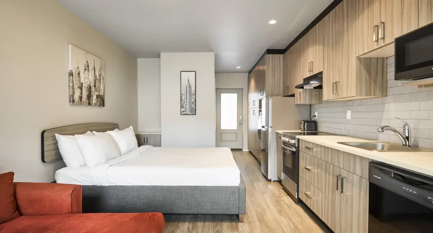 Our open-concept studios are bright and spacious, complete with a comfy couch where you can watch the 42″ 4K Telus Optik TV featuring basic cable. The TV also allows you to log in to your movie subscription services, like Netflix, so you can catch the next episode of your favourite show.